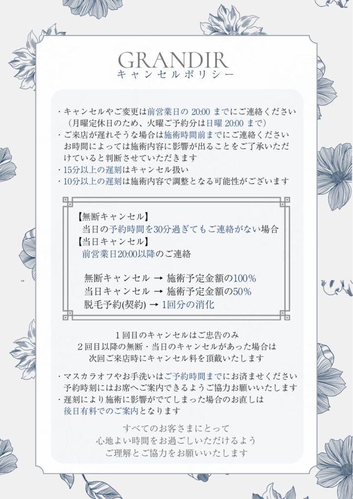 お客様に安心して通っていただけるサロンであり続けるため、誠に心苦しいお願いではございますが、何卒ご理解とご協力を賜りますようお願い申し上げます。
