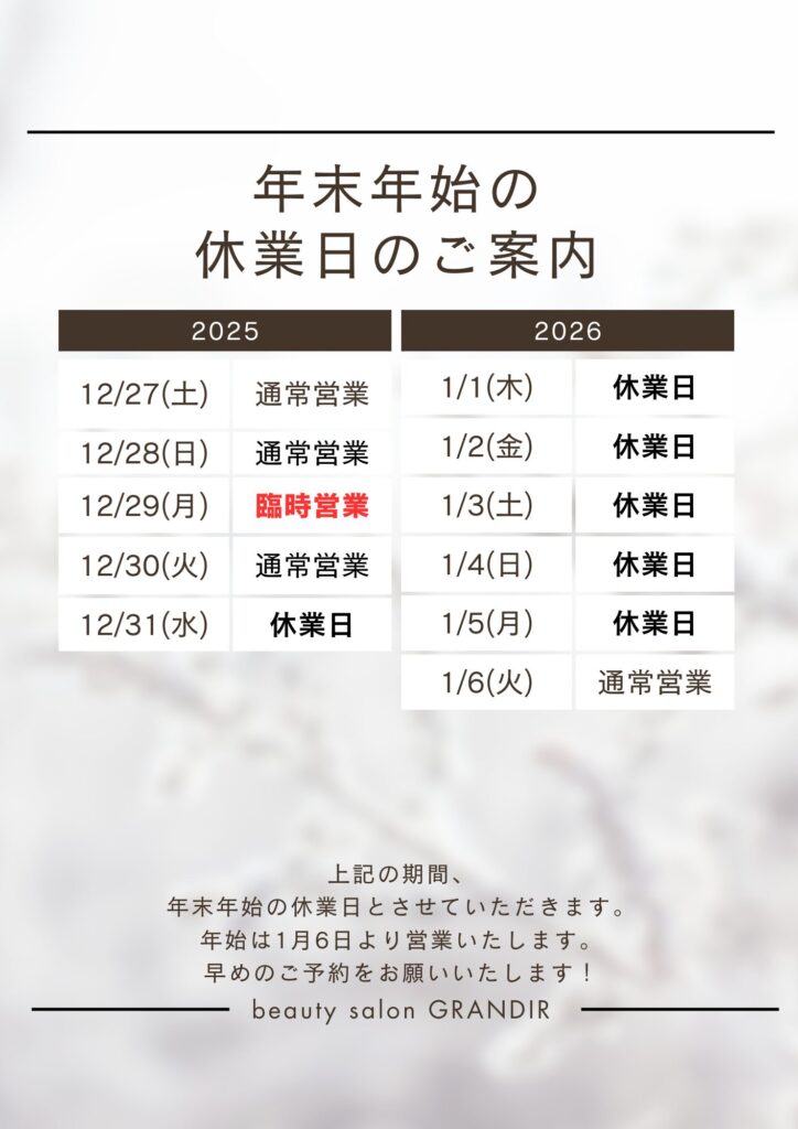 2025年12月は30日まで営業 29日(月)・30日(火)は営業しております。 2026年1月6日(火曜日)から営業 ※長期お休みとなりますので早めのご予約をお願いいたします。